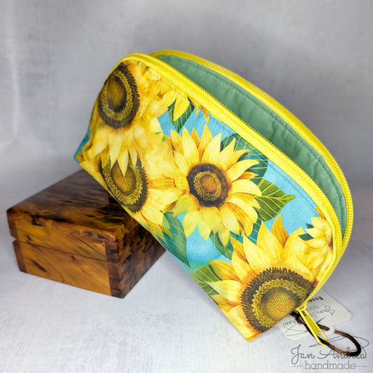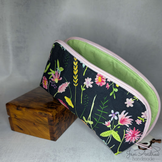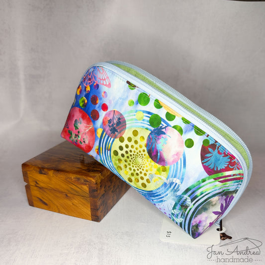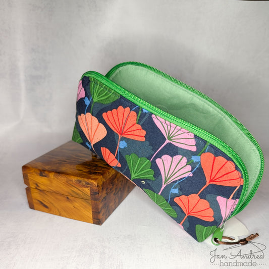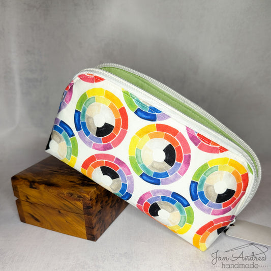 Hidden in this prism-shaped pouch are two rows of elastic, sewn down to create 14 partitions. While the pattern was designed for essential oils (and you can certainly use it that way!), it's also the perfect size for nail polish, lipstick, food dyes, or whatever other small cylinders you need to organize. 8" long, 5" tall, and 3.5" wide at the base, tapering to the zipper. Curved sides mean it opens as wide as you need it to.