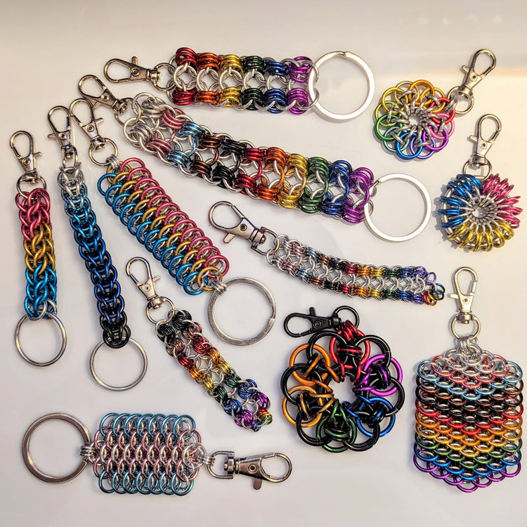 Chainmaille is my go-to evening activity -- I can't just sit and watch a video, I have to be doing something with my hands. It's often how I unwind from the day, and express some creativity. In this collection, you'll find a wide variety of styles, from pride flags to floral-formed mandalas, and I've included videos with some of them so you can get an idea of how they feel in hand.