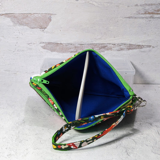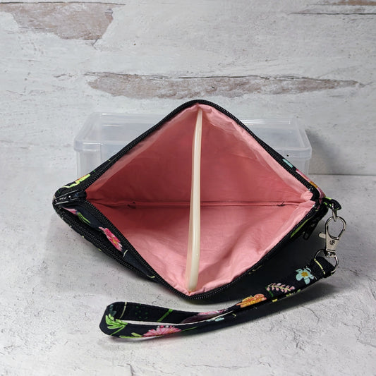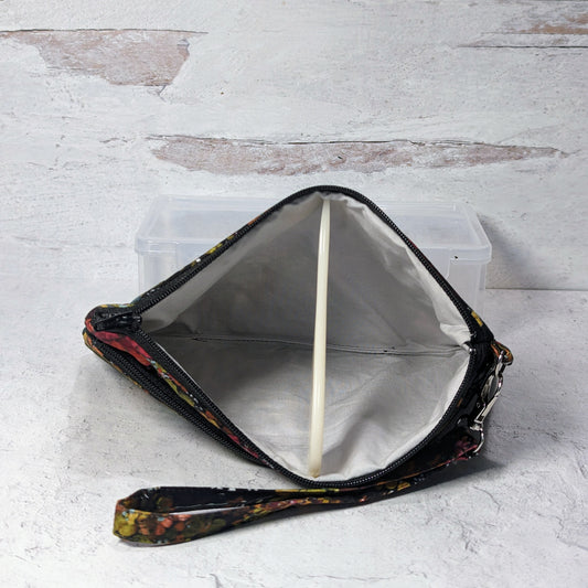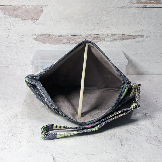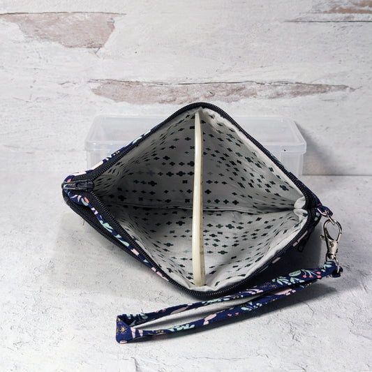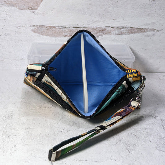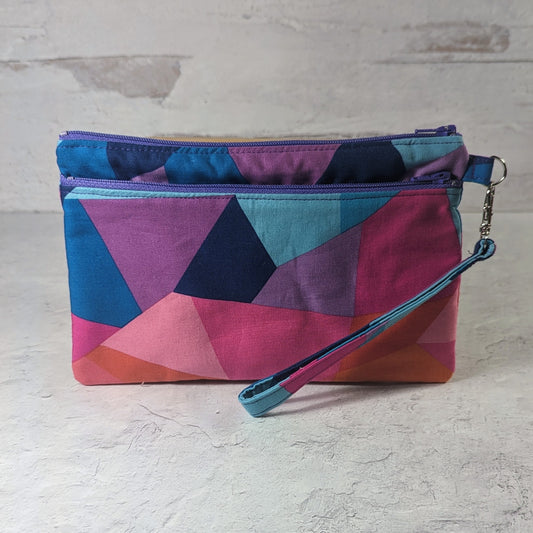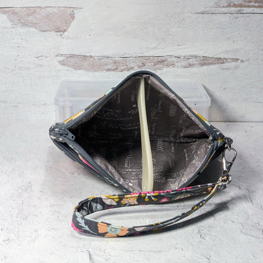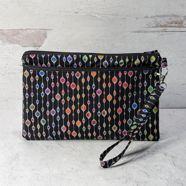 Perfectly handy wristlet with detachable strap and two fully-lined zipped compartments. At 8.5" by 5.5", it fits most phones (even with a bulky hard case) and oodles of objects, but is still small enough to hold comfortably in hand or organize a larger bag.