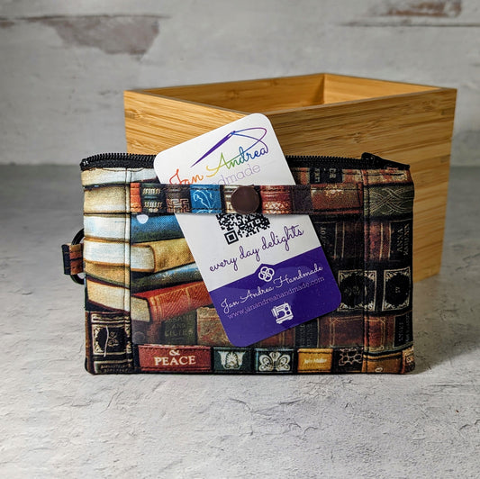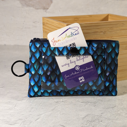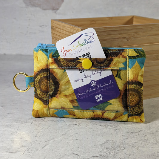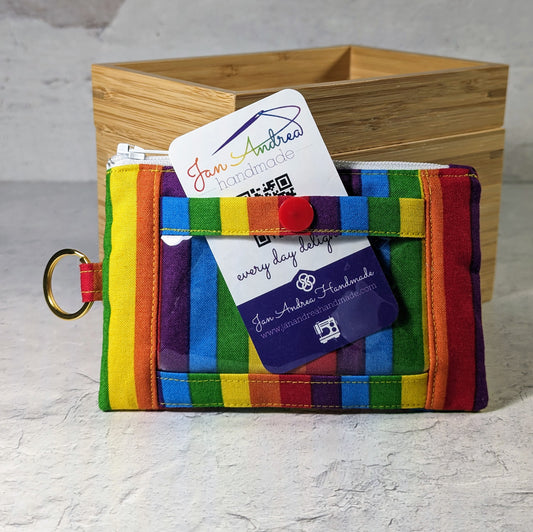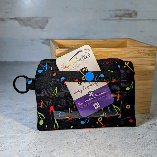 A minimalist wee wallet to keep the essentials within reach -- ID in its clear pocket (with a snap for extra security), cards, cash, change, and Chapstick in the zippered pocket. Measures 5.5" wide by 3.5" tall, and includes a coordinating keyring so you can attach it to a lanyard or wristlet, or add your keys for a truly all-in-one organizer. More fabric choices on the way!