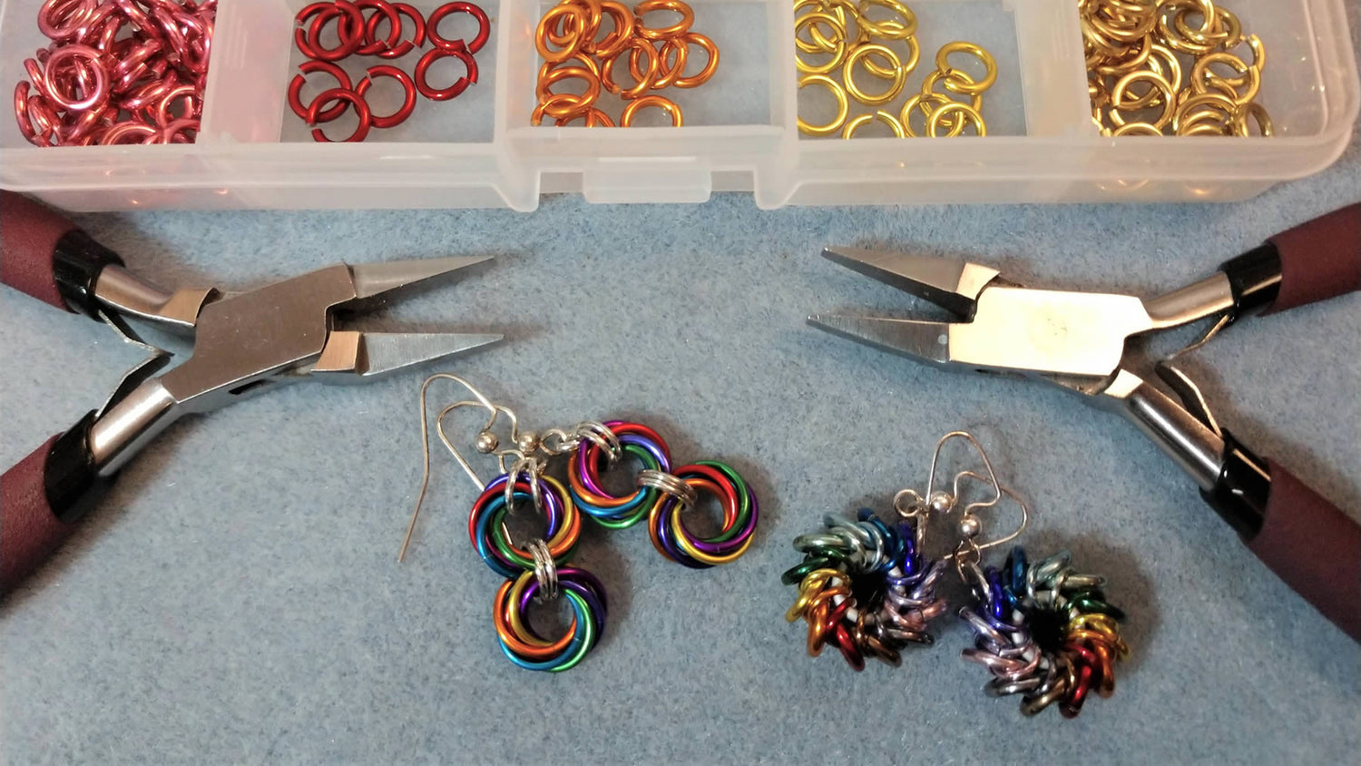 Shiny, colorful, lightweight earrings -- made with anodized aluminum jump rings or...