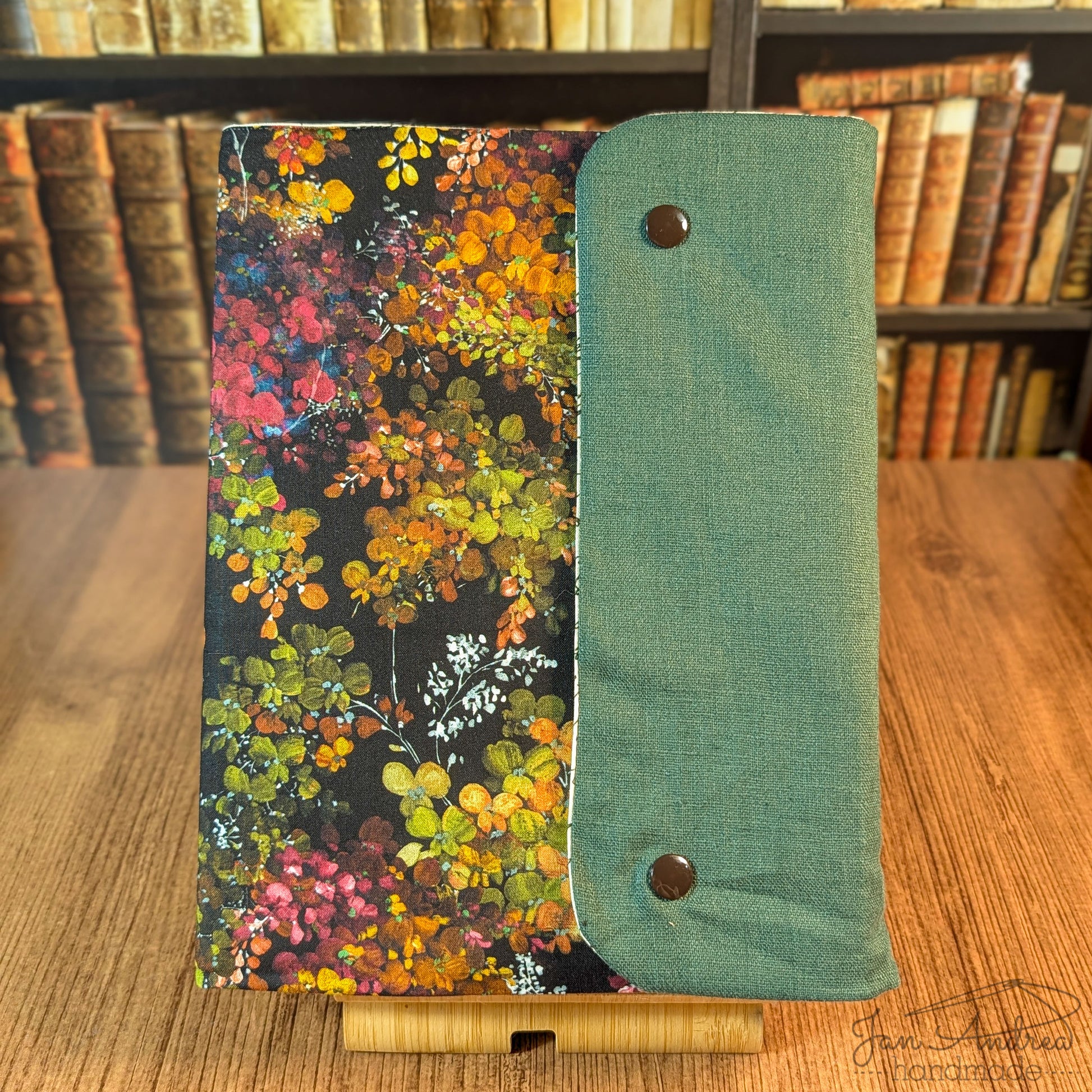 Autumn foliage print with forest green linen accent panel; flower parts contrast sleeve inside.