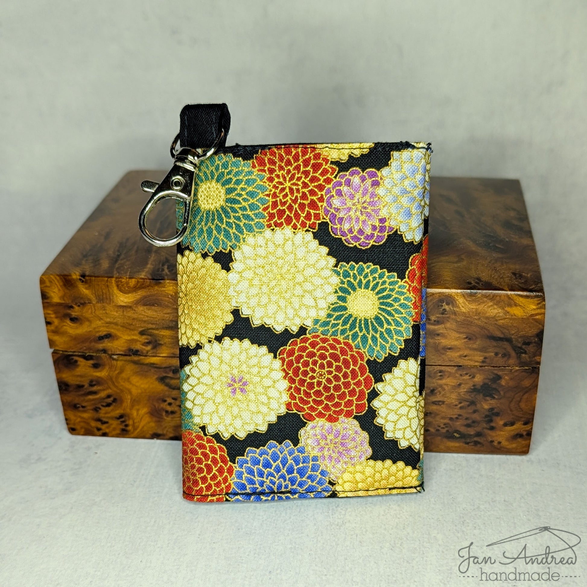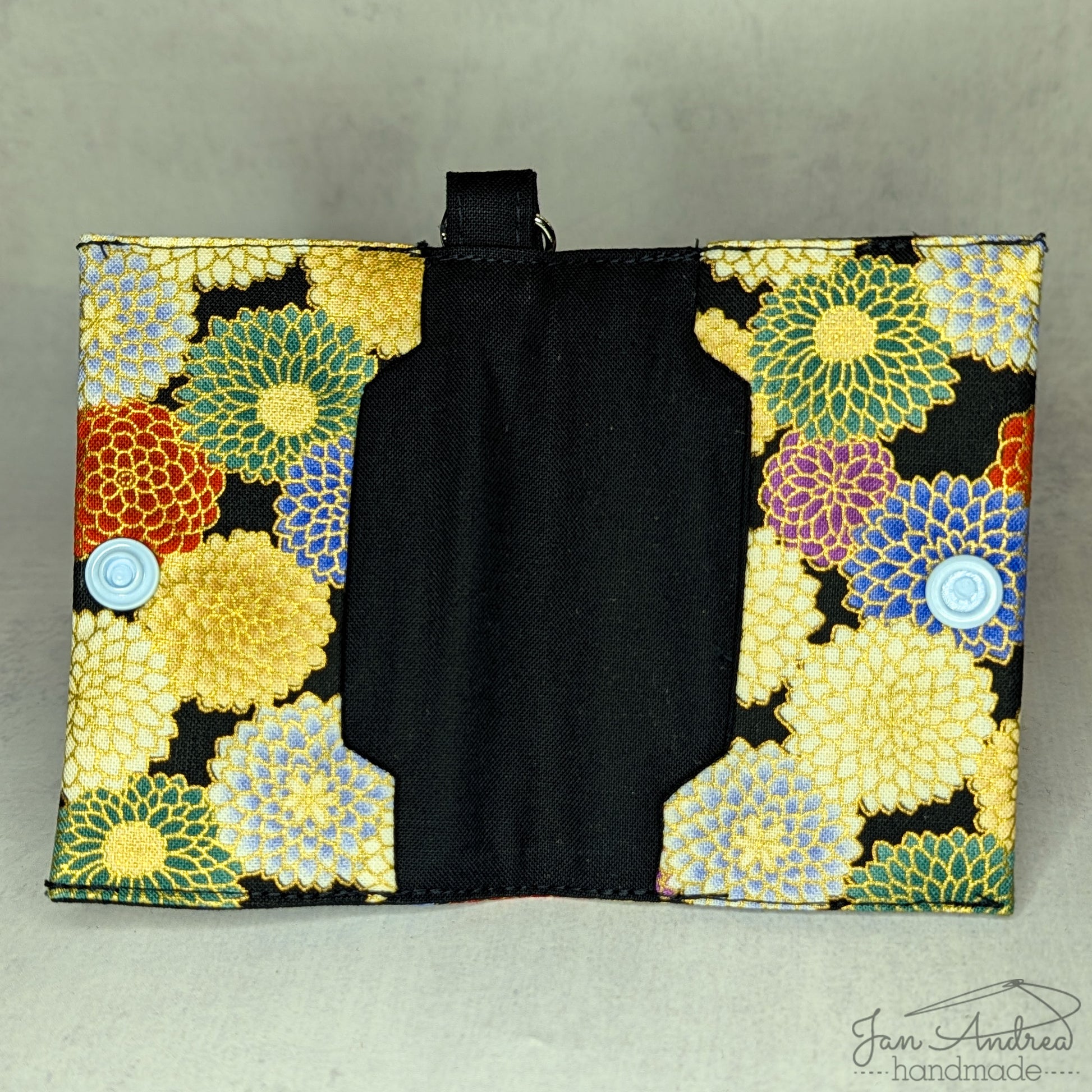Outer fabric: Japanese-style chrysanthemum flowers with metallic accents; inside: black