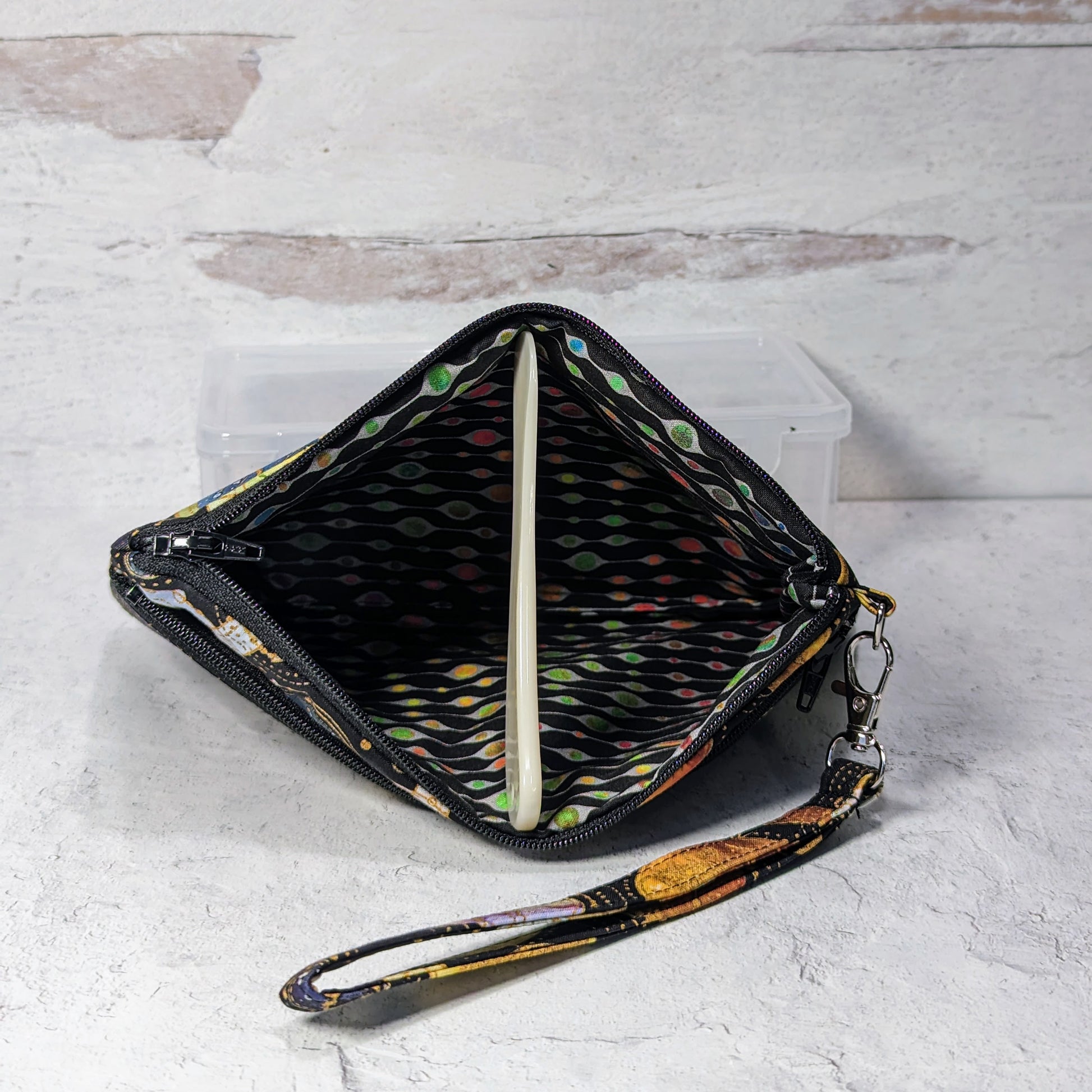 Perfectly handy wristlet with detachable strap and two fully-lined zipped compartments. At 8.5" by 5.5", it fits most phones (even with a bulky hard case) and oodles of objects, but is still small enough to hold comfortably in hand or organize a larger bag.