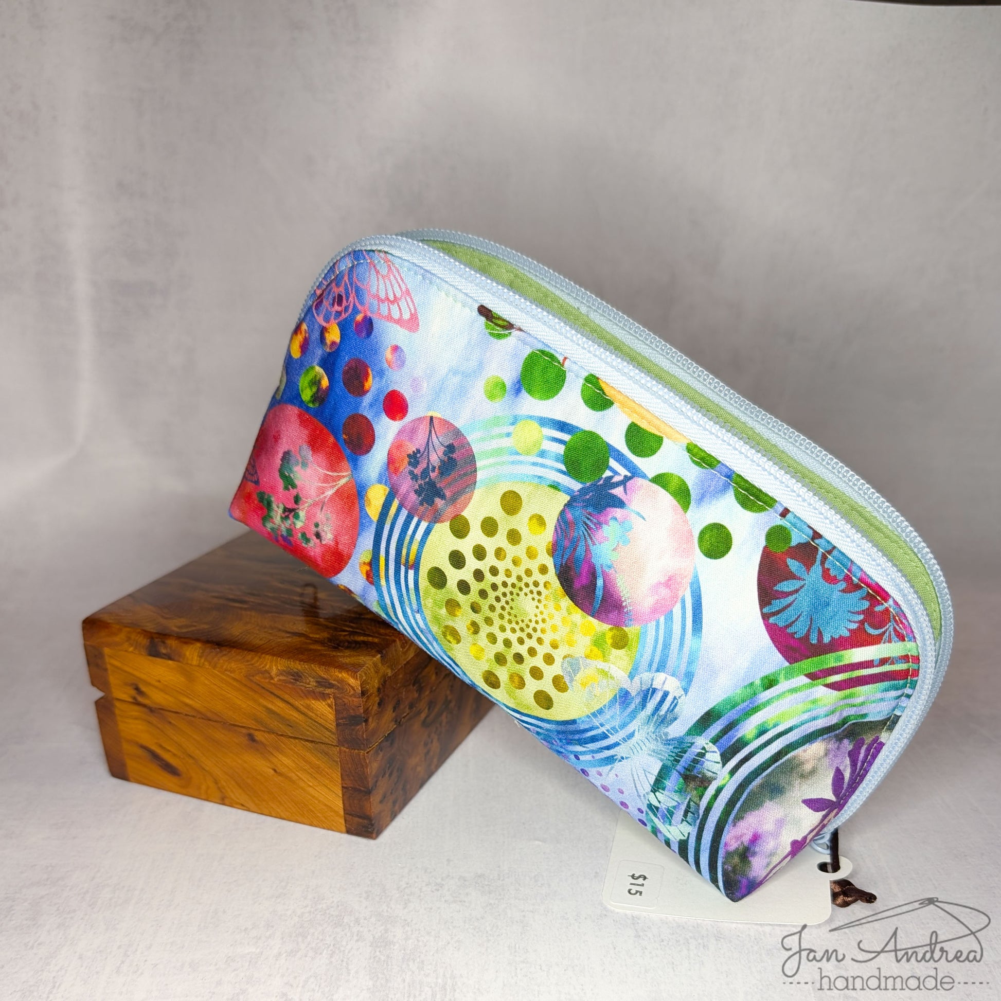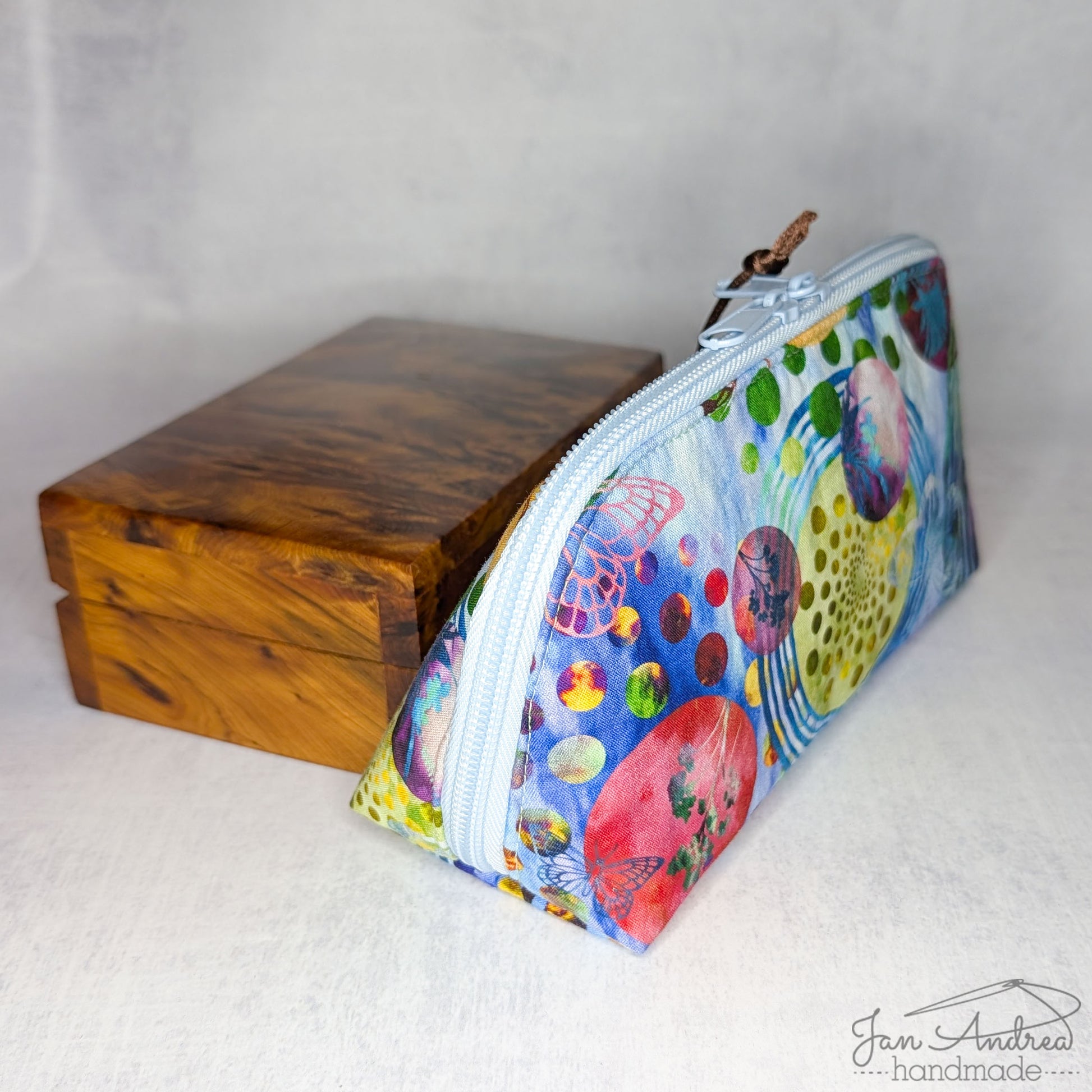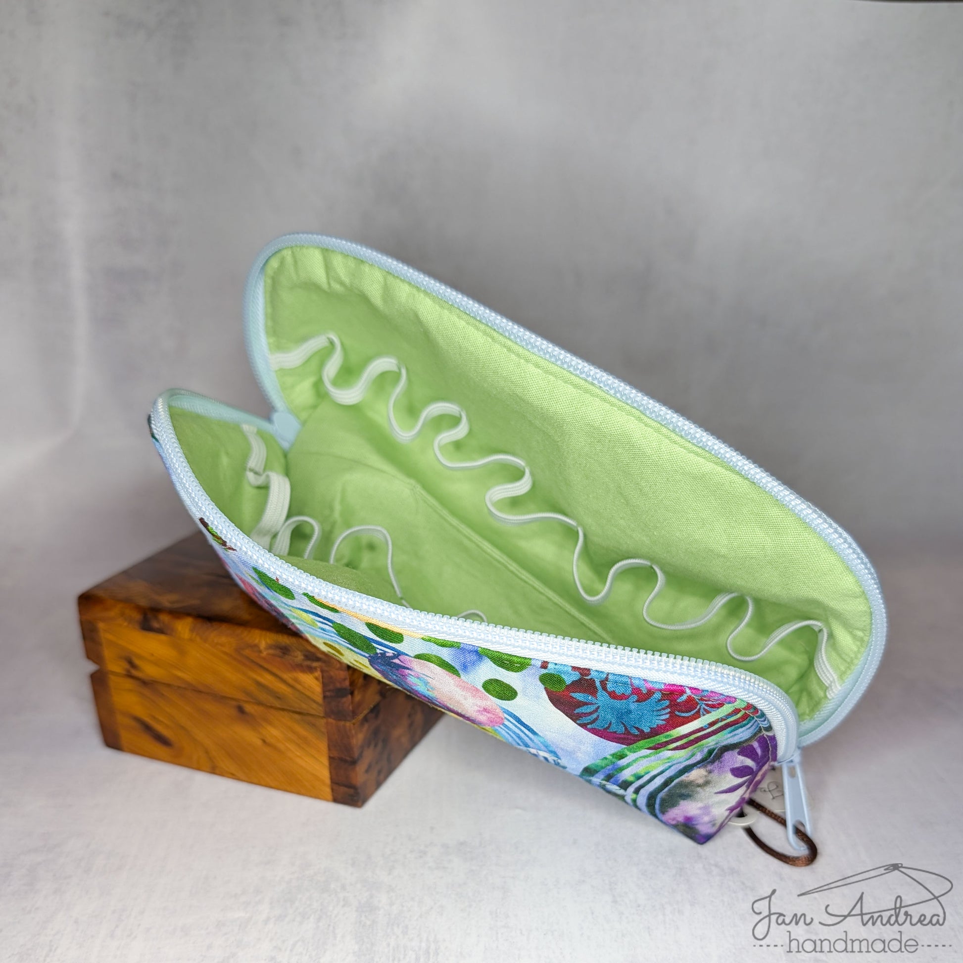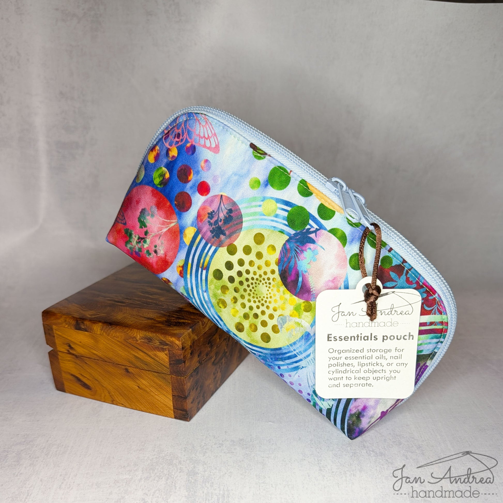 Hidden in this prism-shaped pouch are two rows of elastic, sewn down to create 14 partitions. While the pattern was designed for essential oils (and you can certainly use it that way!), it's also the perfect size for nail polish, lipstick, food dyes, or whatever other small cylinders you need to organize. 8" long, 5" tall, and 3.5" wide at the base, tapering to the zipper. Curved sides mean it opens as wide as you need it to.