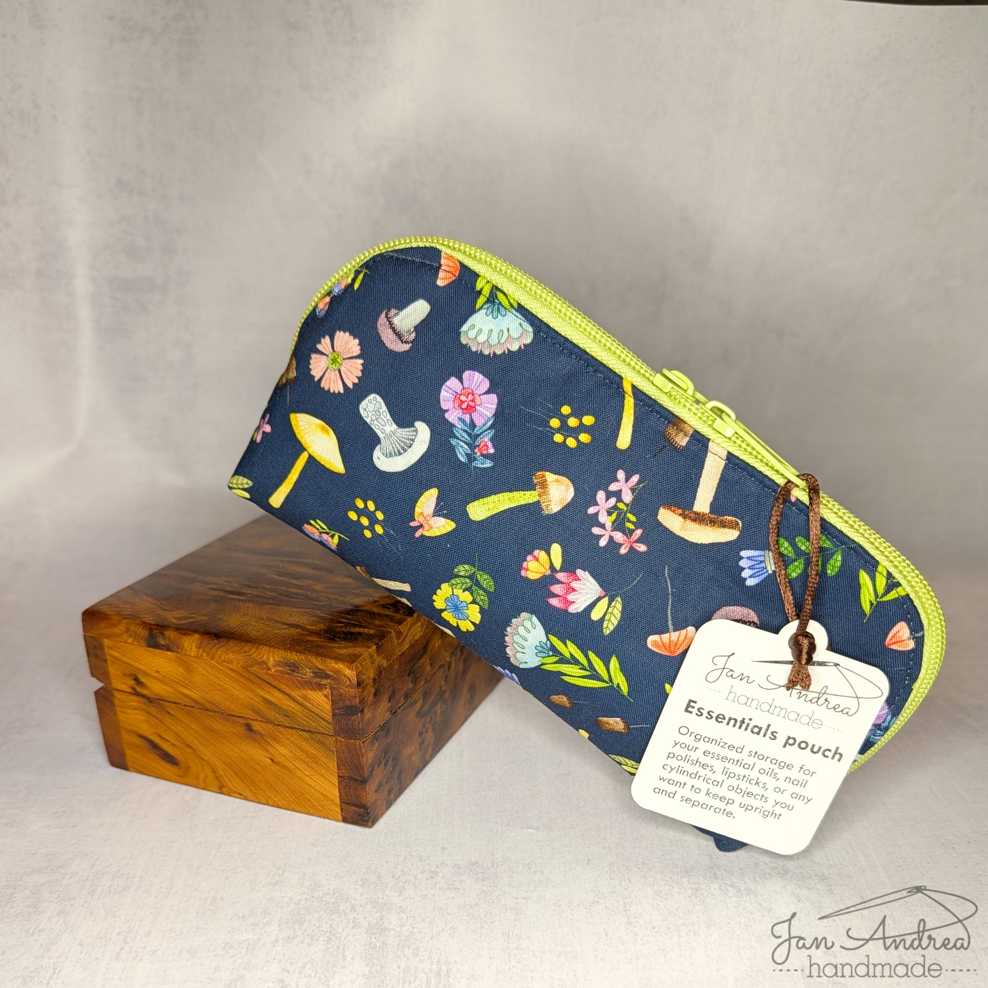 Hidden in this prism-shaped pouch are two rows of elastic, sewn down to create 14 partitions. While the pattern was designed for essential oils (and you can certainly use it that way!), it's also the perfect size for nail polish, lipstick, food dyes, or whatever other small cylinders you need to organize. 8" long, 5" tall, and 3.5" wide at the base, tapering to the zipper. Curved sides mean it opens as wide as you need it to.