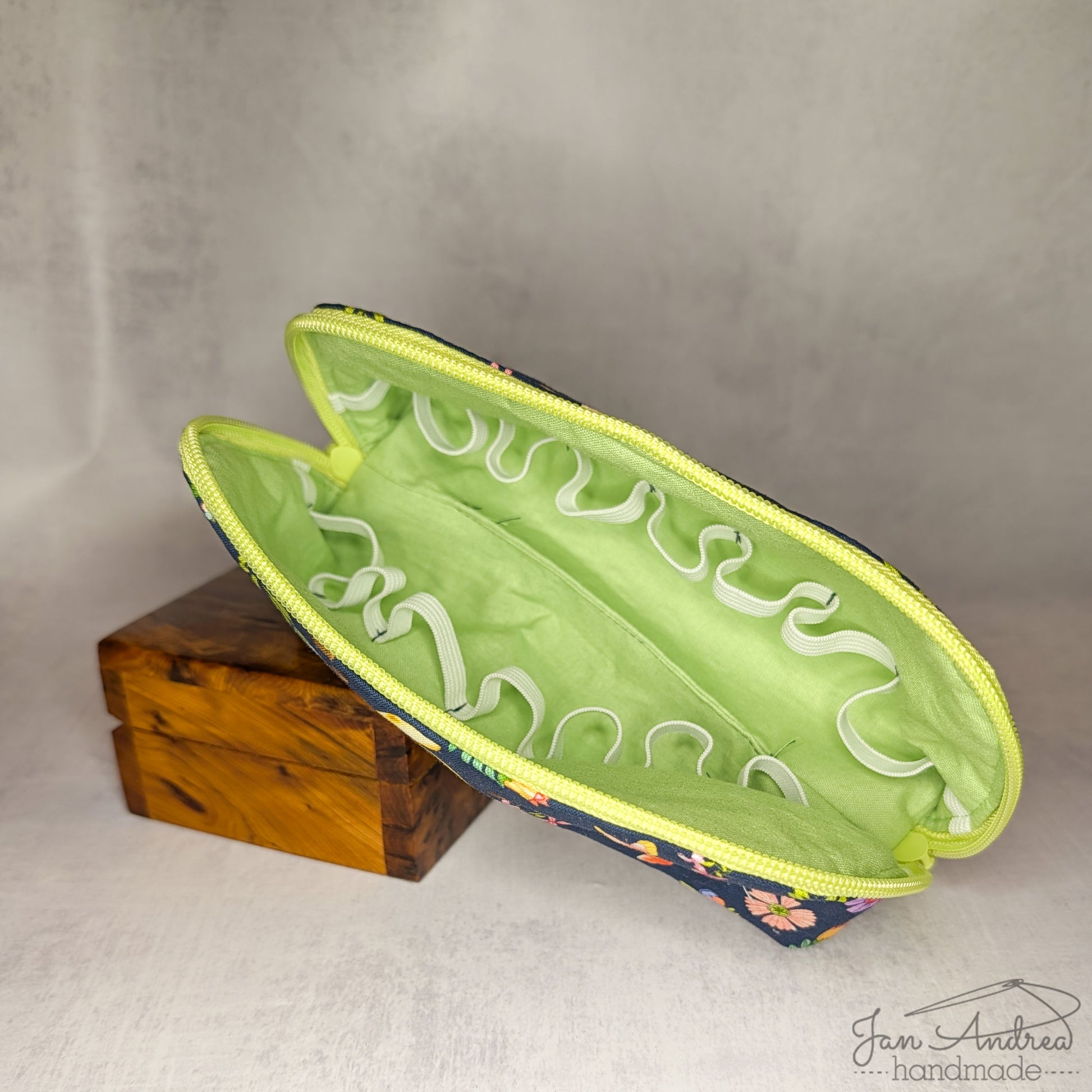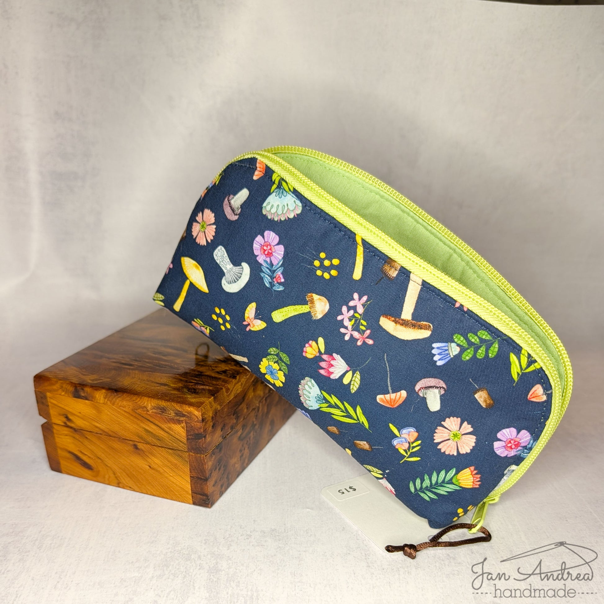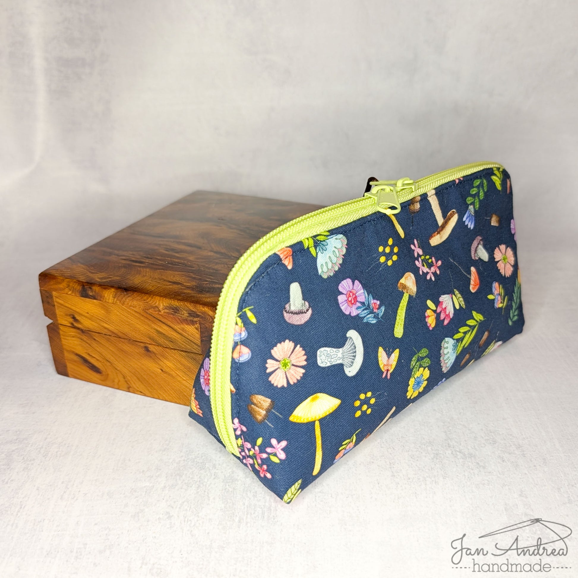 Outer: colorful flowers, leaves, and mushrooms on navy blue; inner: soft green