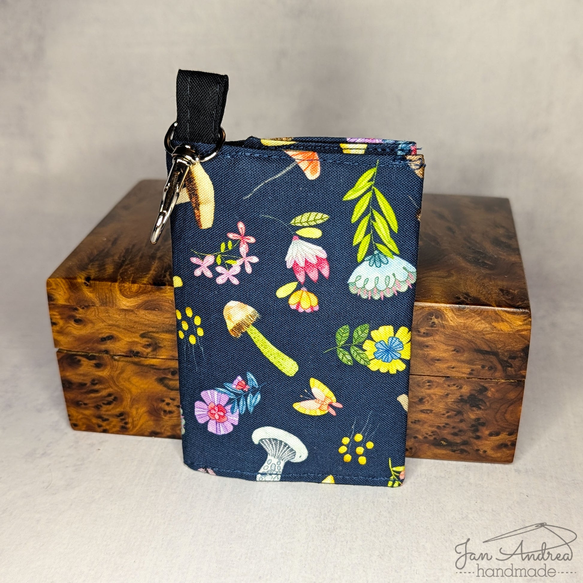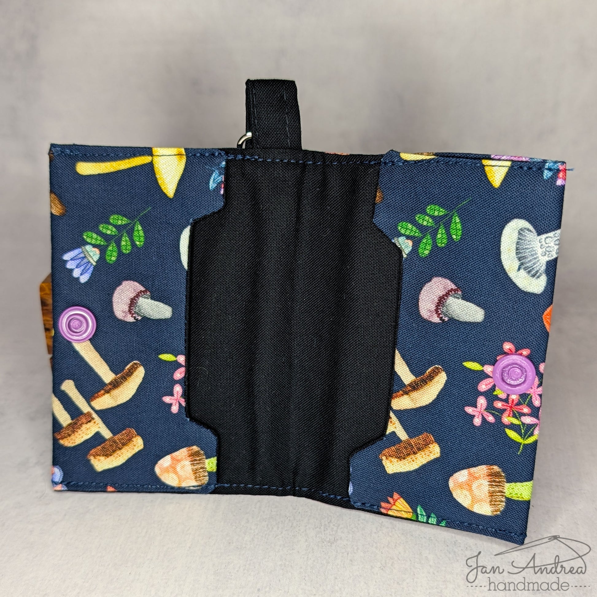 Outer fabric: flowers and fungi scattered on a navy blue background; inside: black