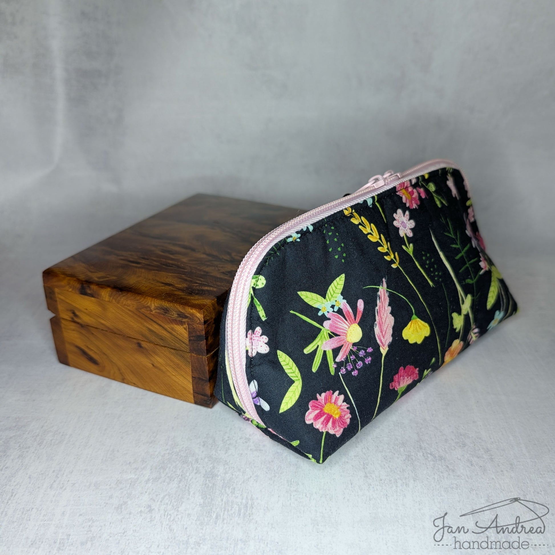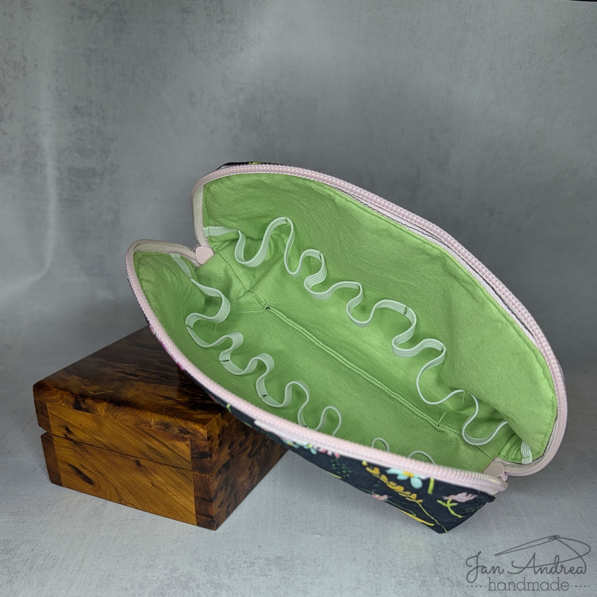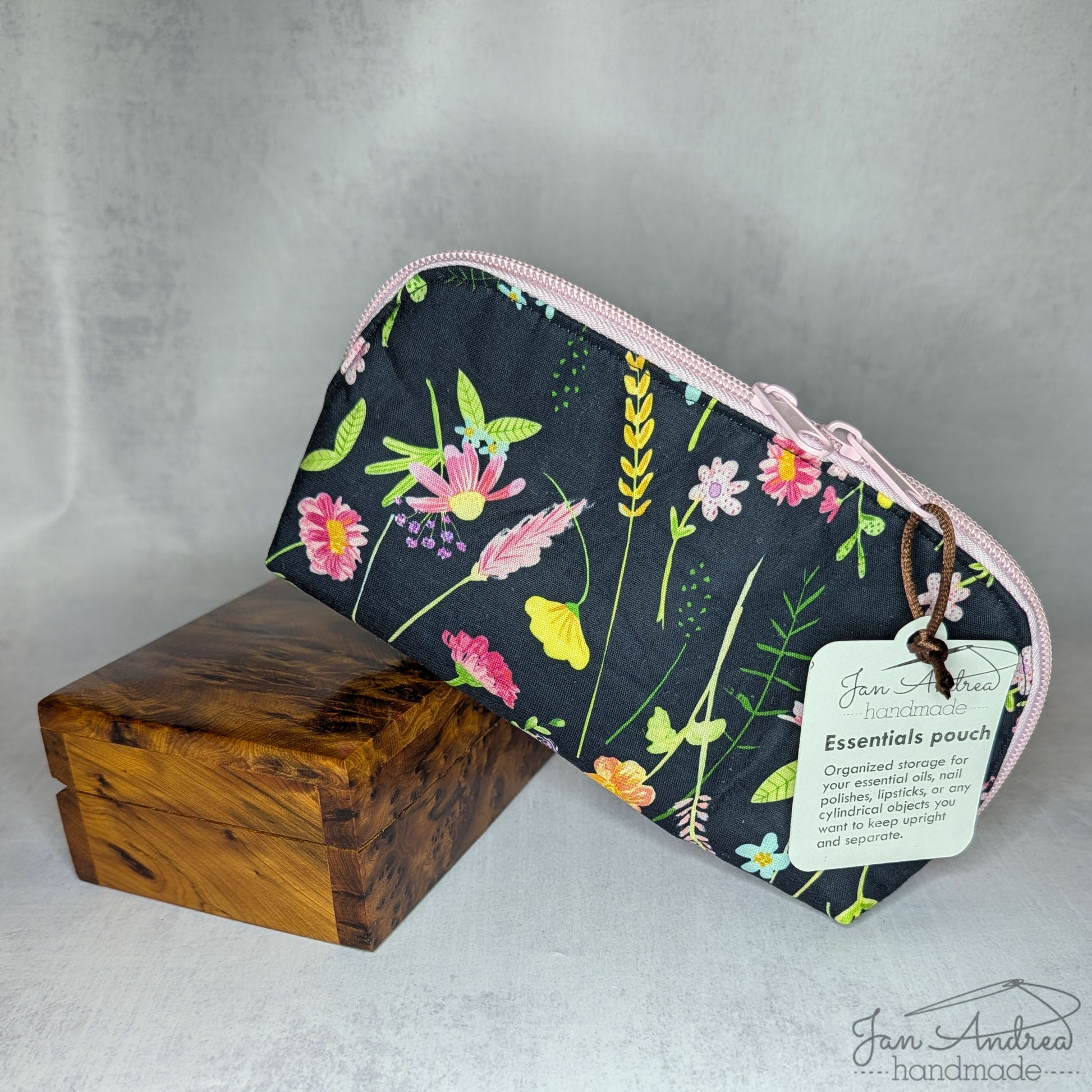 Hidden in this prism-shaped pouch are two rows of elastic, sewn down to create 14 partitions. While the pattern was designed for essential oils (and you can certainly use it that way!), it's also the perfect size for nail polish, lipstick, food dyes, or whatever other small cylinders you need to organize. 8" long, 5" tall, and 3.5" wide at the base, tapering to the zipper. Curved sides mean it opens as wide as you need it to.