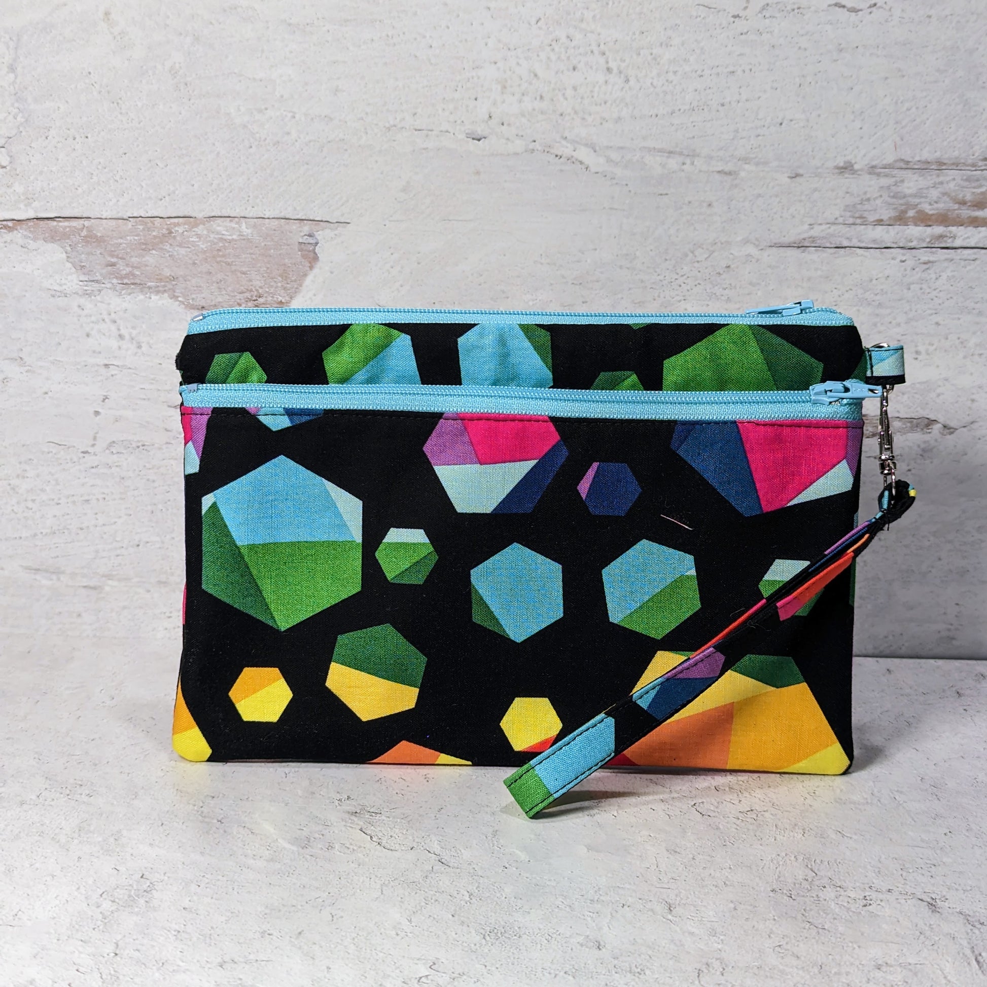 Perfectly handy wristlet with detachable strap and two fully-lined zipped compartments. At 8.5" by 5.5", it fits most phones (even with a bulky hard case) and oodles of objects, but is still small enough to hold comfortably in hand or organize a larger bag.