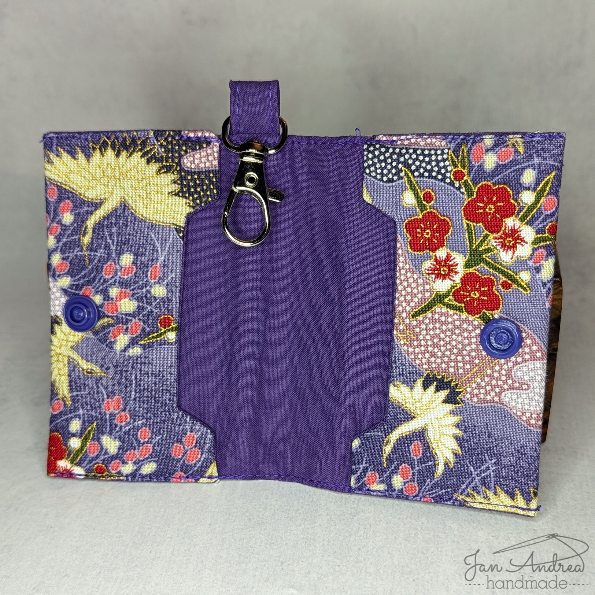 Outer fabric: Japanese-style cranes and cherry blossoms with metallic accents; inside: purple