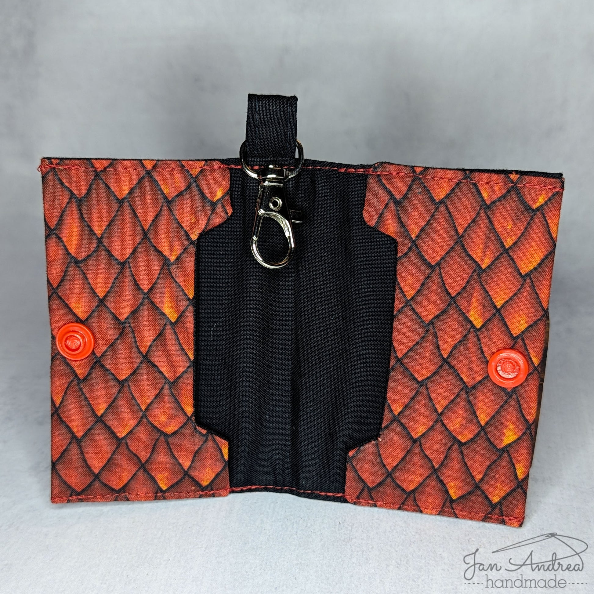 Outer fabric: Red dragonscales; inside: black