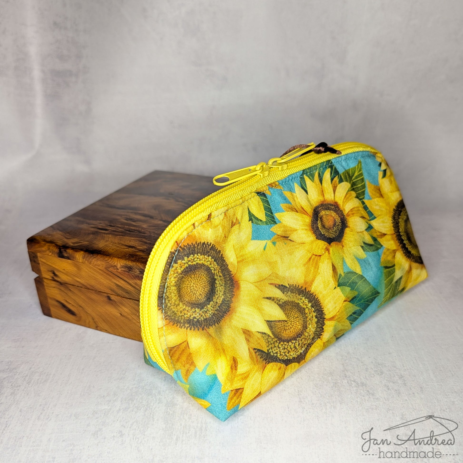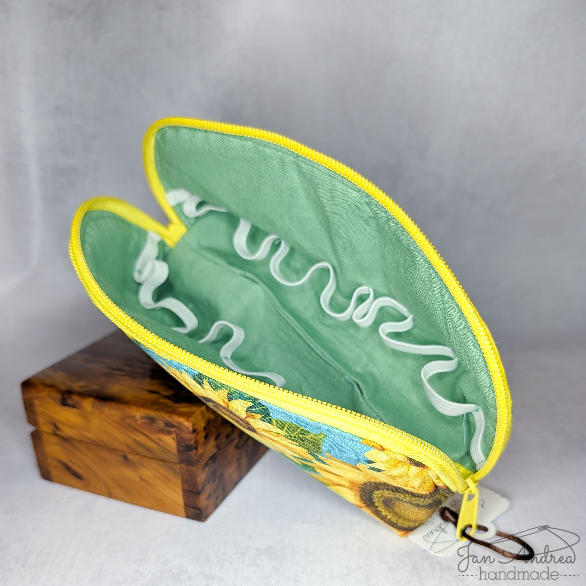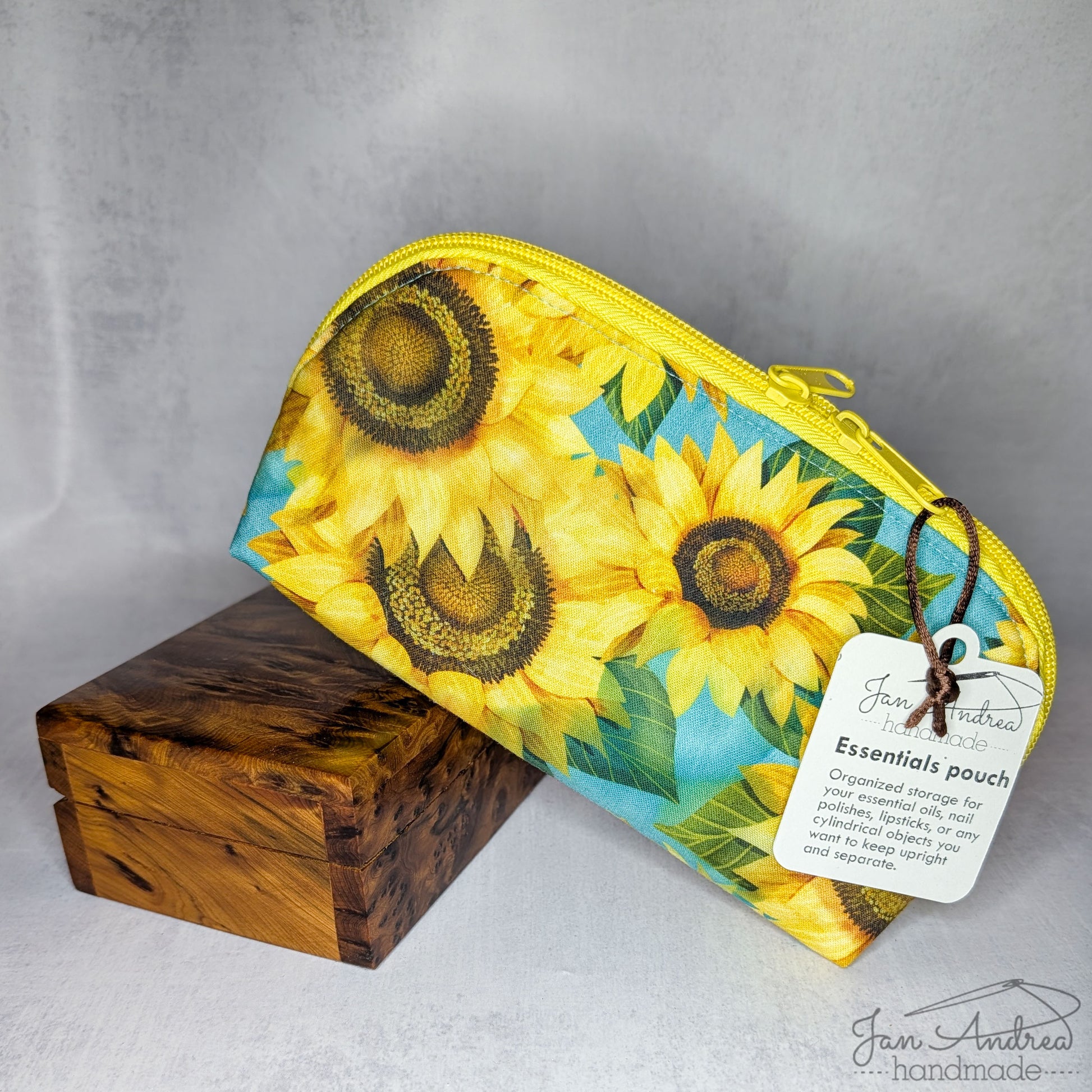 Hidden in this prism-shaped pouch are two rows of elastic, sewn down to create 14 partitions. While the pattern was designed for essential oils (and you can certainly use it that way!), it's also the perfect size for nail polish, lipstick, food dyes, or whatever other small cylinders you need to organize. 8" long, 5" tall, and 3.5" wide at the base, tapering to the zipper. Curved sides mean it opens as wide as you need it to.